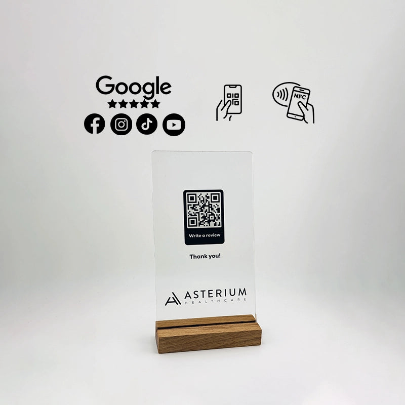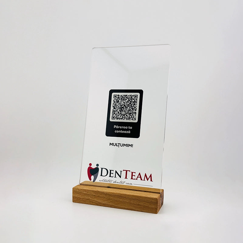 Plasează display-ul de recenzii într-un loc vizibil si invita clienții să-și împărtășească gândurile și să ofere recenzii printr-un proces simplu online. Acestia scaneaza codul QR sau ating telefonul de zona marcata cu " NFC" si datorita tag-ului NFC sunt trimisi direct in pagina de recenzii, unde completeaza recenzia si numarul de stelute. Nu e necesar niciun alt pas suplimentar! Este o modalitate interactivă și distractivă de a îmbunătăți experiența clienților și de a consolida relația cu comunitatea ta.